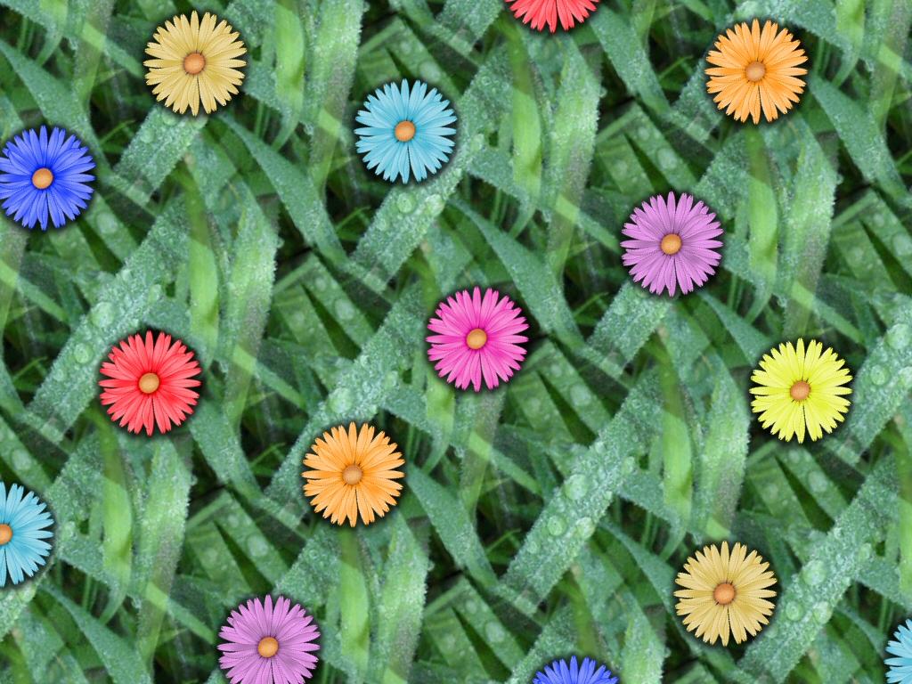 Multi-colored daisies scattered on a background of grass....