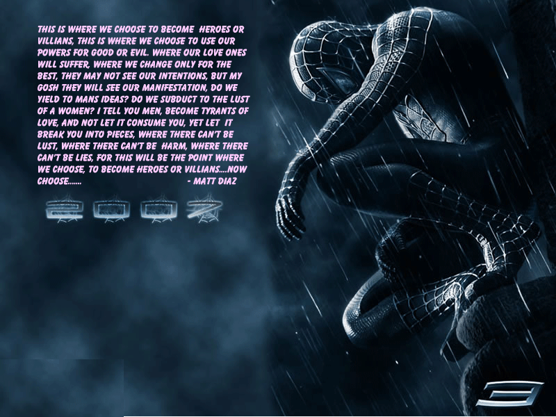 This is a picture of spiderman, and it includes a deep qoute i wrote, dealing with Spiderman and presenting him with a new life.