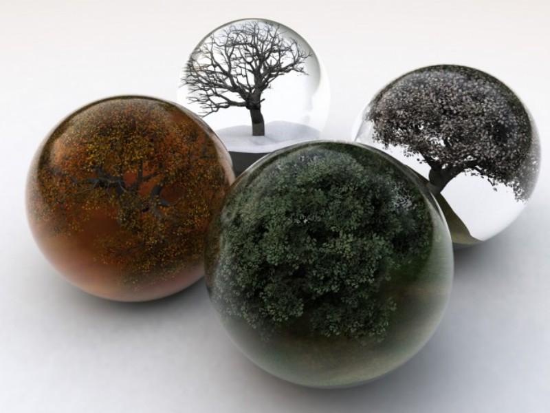Four globes with representations of the seasons in them